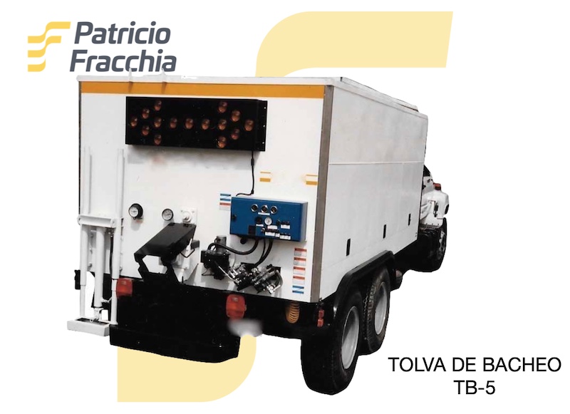 Montada sobre camion, la tolva de almacenamiento de material de bacheo esta construida de chapa soldada eléctricamente. Laterales debidamente calefaccionados por circulación de aceite térmico. Tolva con aislamiento térmico consiguiendo una eficiente conservación térmica y ahorro de combustible. Puertas en la parte superior aisladas térmicamente como métodos de conservación de la temperatura y protección de lluvias. Escalera y piso antideslizante. Tornillo alimentador revestido con aporte anti-desgaste ye impulsado hidráulicamente para el suministro del material sellante. Bandeja deslizadora rebatible y direccional al final del tornillo alimentador.